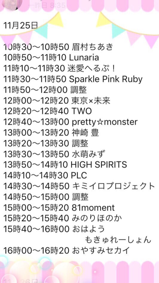 出演者:キミイロプロジェクト / みのりほのか / ひなたせり / 迷愛へるぷ / TWO / 東京×未来 / 眉村 ちあき / Lunaria / おはよう!もきゅれーしょん / HIGH SPIRITS / おやすみセカイ / 81moment / 水萌みず / pretty☆monster / SparklePinkRuby / 神崎豊 / unaria / 眉村ちあき / PLC ※予定