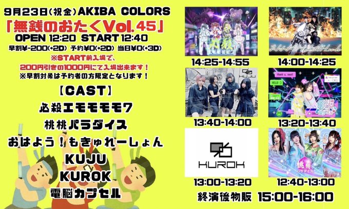 2022.09.21 04:292022/09/23(金・祝)『無銭のおたく』出演情報ご予約はこちら ⇒ おはもきゅイベント予約フォーム[ 予約特典 ] 希望メンバー(全員可)とスマホ・カメラで写真撮影1枚。※特典内容は、予告なく変更される場合がございます予めご了承ください。無銭のおたく日時:2022/09/23(金・祝) 開場 12:20 / 開演 12:40おはもきゅ出演★14:00〜14:25、物販★15:00 ~ 16:00会場:AKIBA COLORS東京都 台東区台東1丁目27−1 K3ビル B1F [ アクセス ]料金:早割¥0(+2D)※¥200引き¥1000予約¥0(+2D) 当日¥0(+3D)※ソフドリの提供になります。出演:こちらをご参照くださいおはよう!もきゅれーしょんフォロー2022.09.21 13:032022/09/23(金・祝)『HANAKIN109』出演情報2022.09.19 05:072022/09/25(日)『池袋グラフィティ』出演情報0コメント1000 / 1000投稿