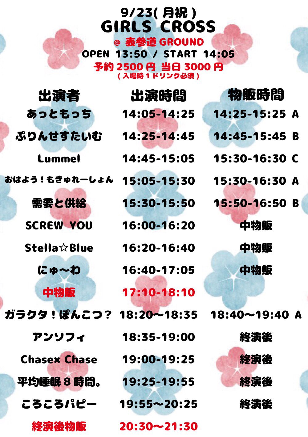 2019.09.13 04:292019/09/23(月)『Girls Face in OMOTESANDO』出演情報ご予約はこちら ⇒ おはもきゅイベント予約フォーム[ 予約特典 ] 希望メンバー(全員可)とスマホ・カメラで写真撮影1枚。※特典内容は、予告なく変更される場合がございます予めご了承ください。Girls Face in OMOTESANDO日時:2019/09/23(月) 開場 13:50 / 開演 14:05 タイムテーブルおはもきゅ出演★15:05 ~ 15:30、物販★15:30 ~ 16:30※開場・開演時間、出演者等は、変更になる場合がございます。予めご了承ください。会場:表参道GROUND東京都渋谷区神宮前4-2-12 [ アクセス ]料金:予約2,500円(+1D) / 当日3,000円(+1D)出演:タイムテーブルご参照くださいおはよう!もきゅれーしょんフォロー2019.09.13 10:052019/09/29(日)『BLACK HISTORYラストライブ』出演情報2019.09.13 04:262019/09/22(日)『エモーショナルアイドル【SEPTEMBER】二部』出演情報0コメント1000 / 1000投稿